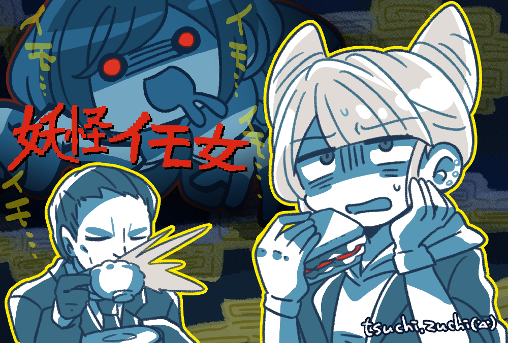 都市伝説解体センターの二次創作「妖怪イモ女」の愚痴をこぼすトシカイのジャスミンさんとそれを聴いて紅茶噴き出してる富入さん#一枚絵 #二次創作 2025.11.7(Fri) 14:02:52 絵 edit