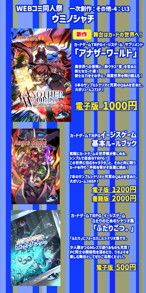 オンラインイベント「WEBコミ同人祭」に参加します!スペース 一次創作:その他-4: い3 サークル名 「ウミノシャチ」 #イベント参加情報【イベントページはこちら】 2025.12.26(Fri) 01:39:17 おしらせ edit
